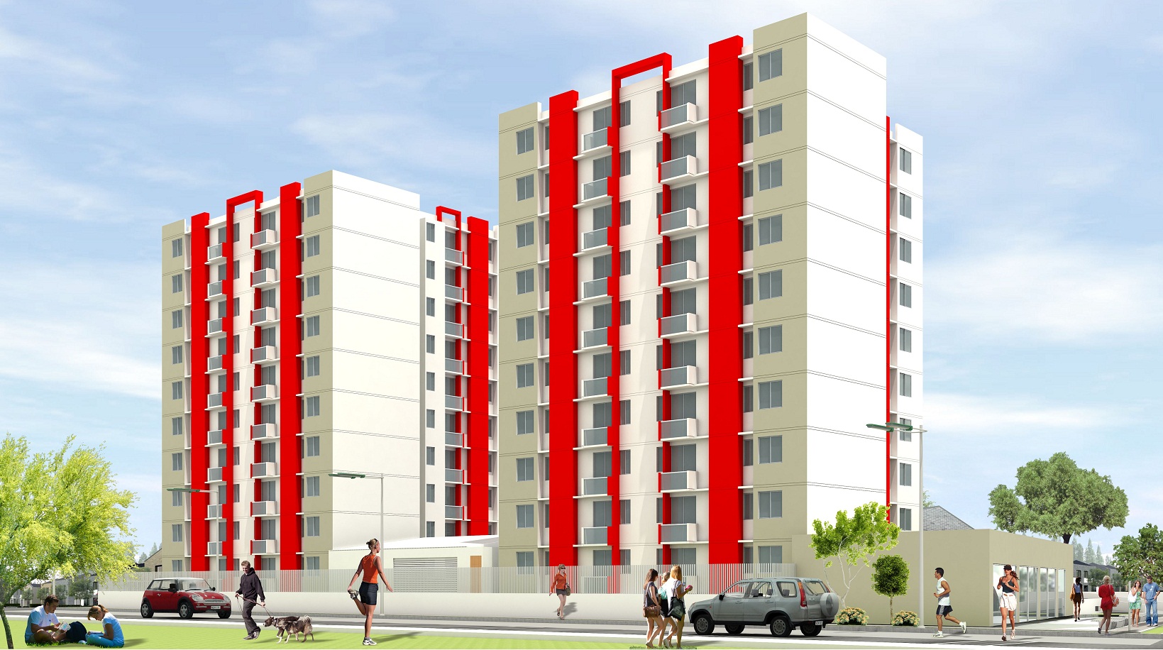 Está conformado por 2 torres de 10 pisos cada una, parqueaderos, red contraincendios, un salón social abierto, piscina para adultos y niños, juegos infantiles y planta eléctrica en zonas comunes.