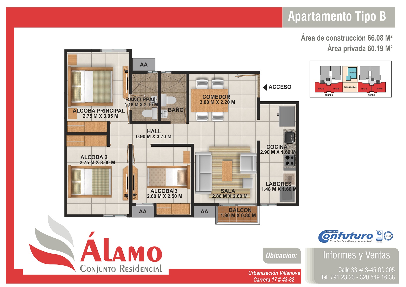 Apartamentos de tres alcobas, dos baños, sala-comedor, cocina, zona de labores y balcón. Con áreas de 66.08m2.