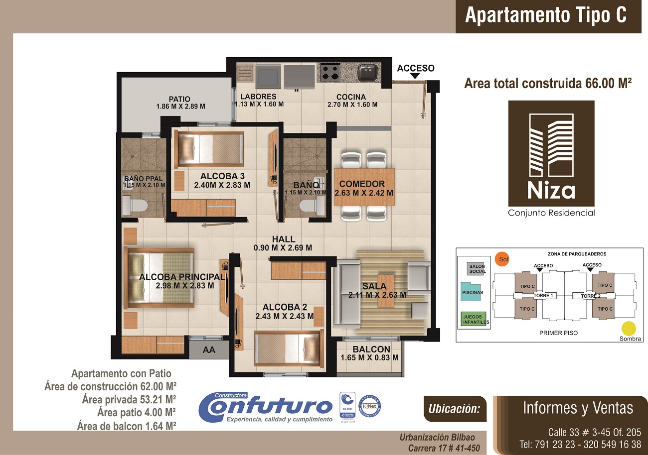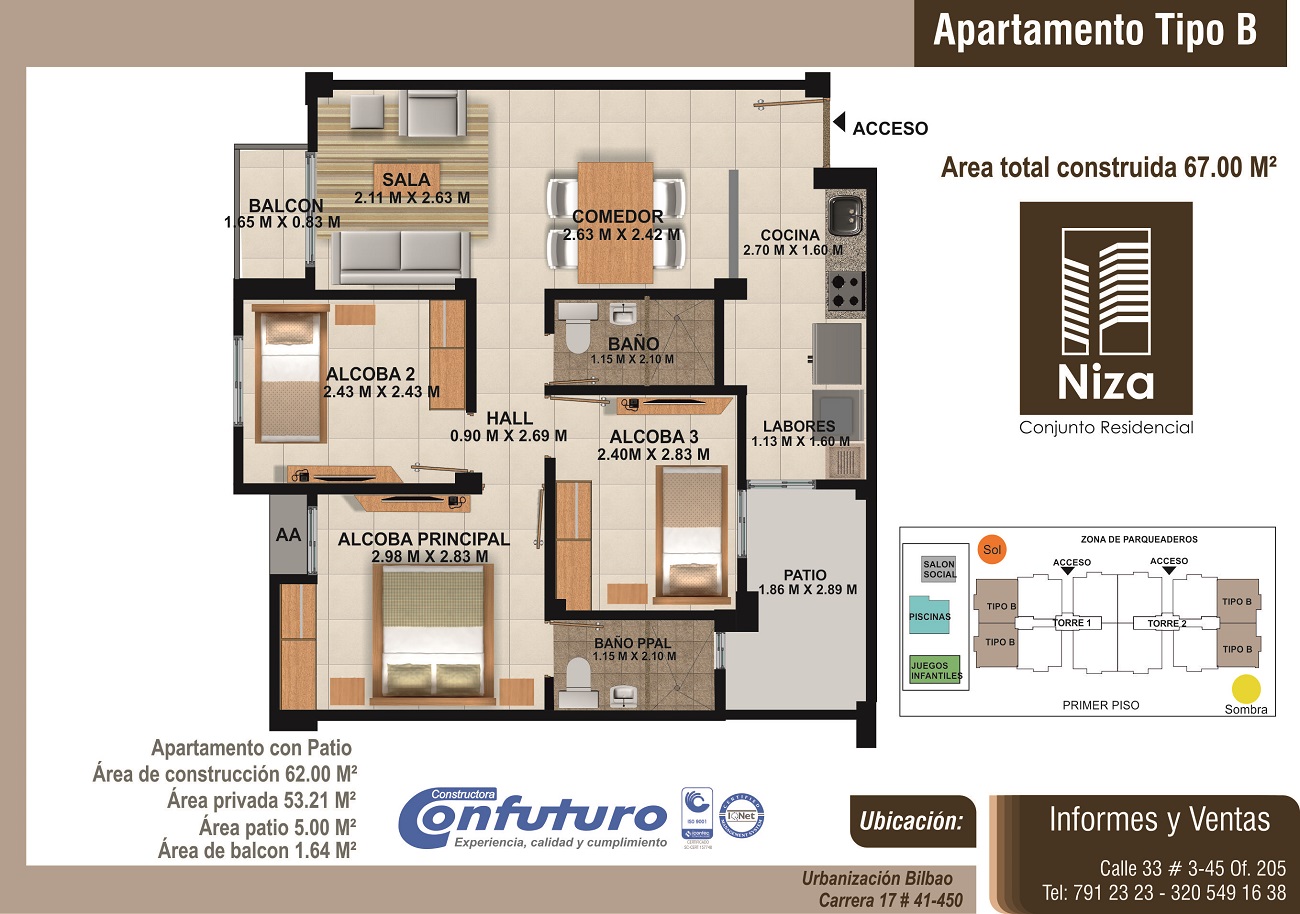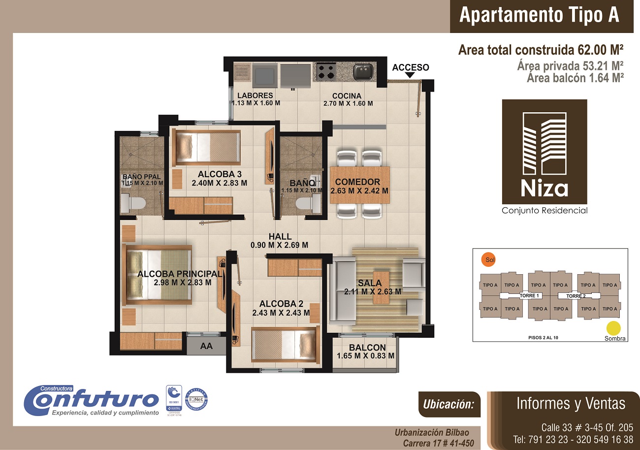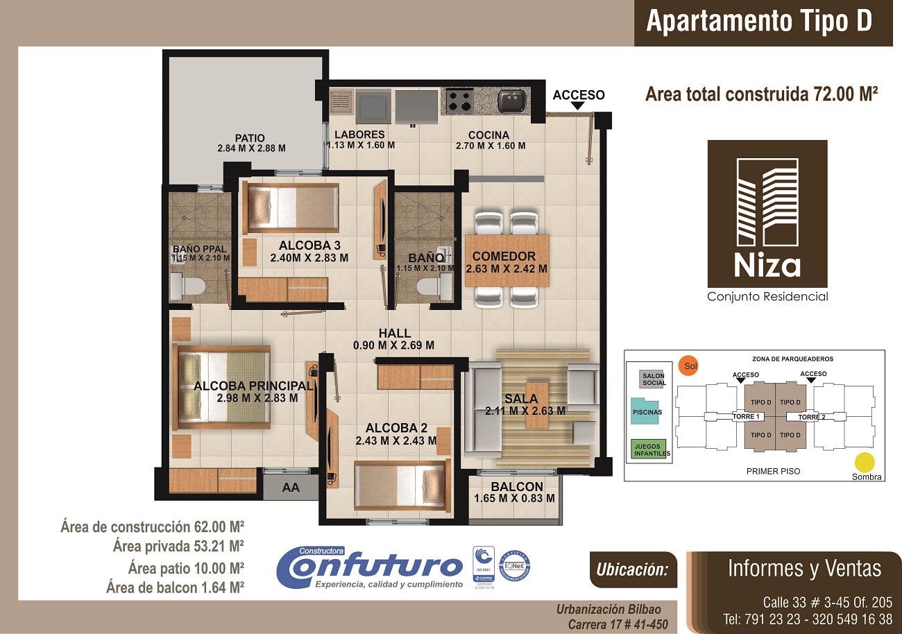 Apartamentos de tres alcobas, dos baños, sala-comedor, cocina, zona de labores y balcón, con áreas desde 62m2 hasta 72m2